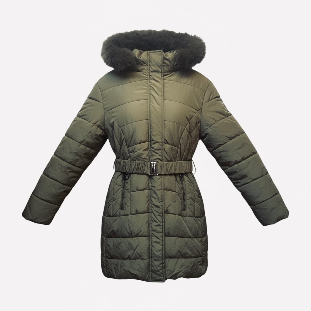 Winterjas groen met ceintuur en bontkraag