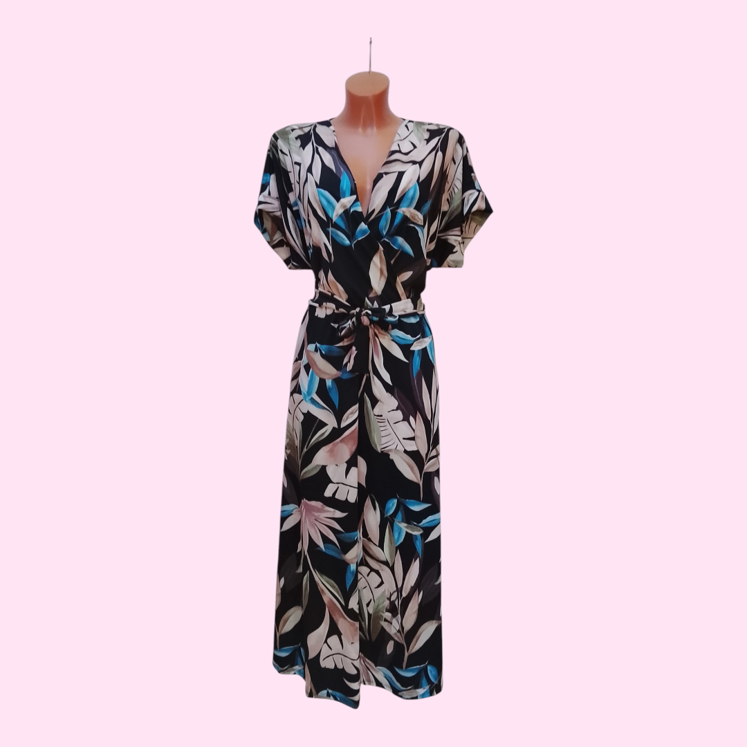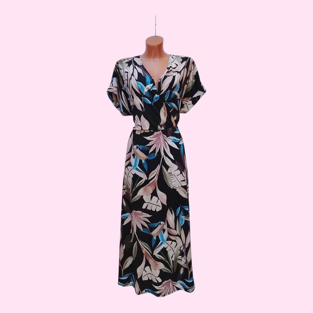 Deze stijlvolle zwarte maxi jurk met prachtige tropische print is een echte must-have voor je garderobe! De jurk heeft een flatterende V-hals en een soepel vallende stof die comfortabel aanvoelt op de huid. Dankzij de losse pasvorm en elastische taille (met of zonder strikceintuur) is deze jurk geschikt voor maten 38 t/m 44.
