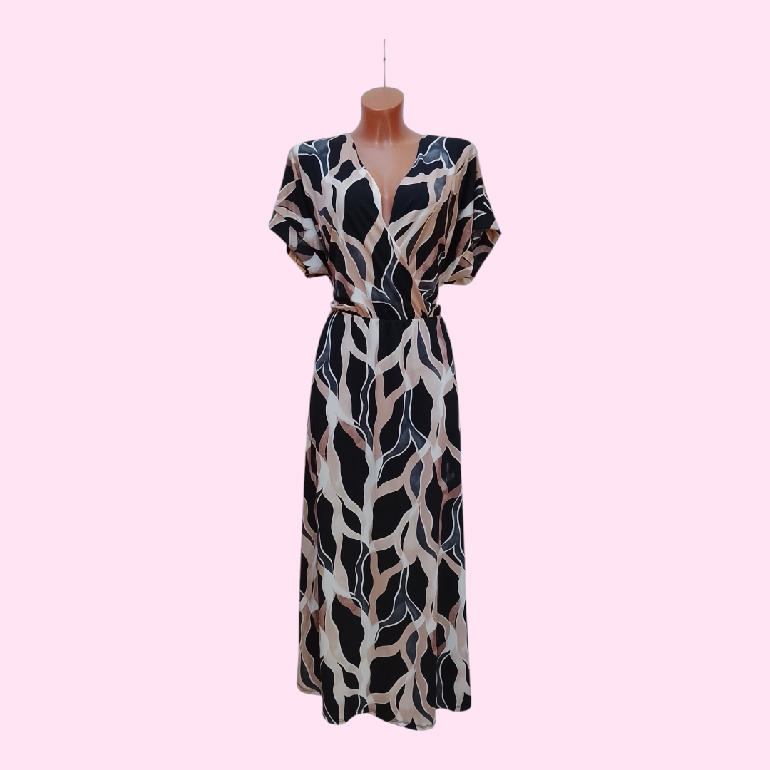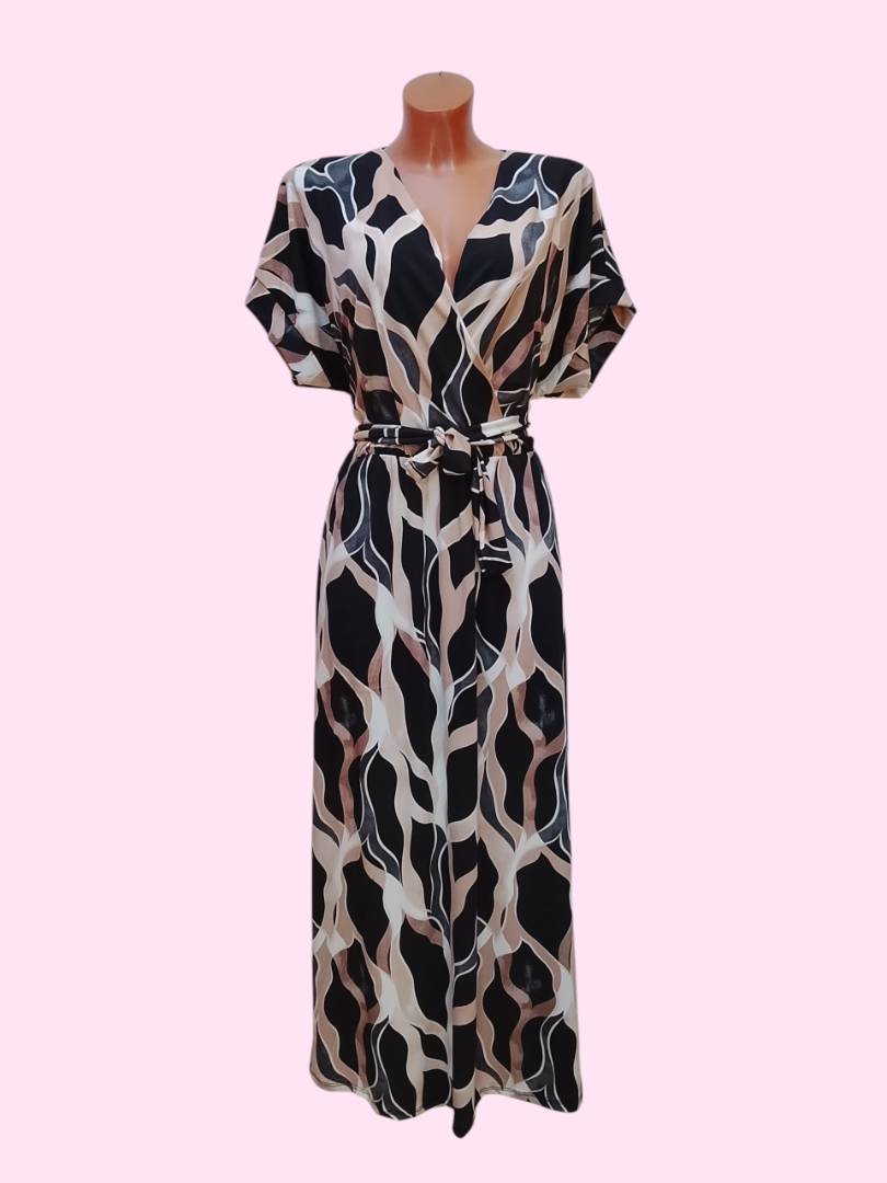 Met zijn prachtige abstracte print in zwart, beige en zachte taupe-tinten straalt de jurk een moderne en chique look uit. De diepe V-hals en de losse, korte mouwen geven een flatterende pasvorm, terwijl de bijpassende ceintuur je taille mooi accentueert.