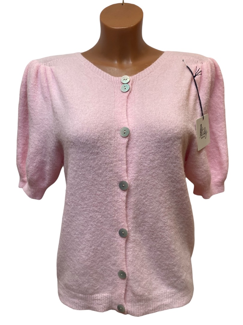 Heerlijk zacht vest in pastelroze met parelmoerkleurige knopen.